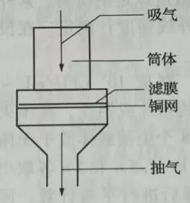 過濾式空氣采樣器是最常用、最簡單的空氣采樣器。過濾式采樣器有采樣頭、濾器、流量計(jì)和抽氣泵組成。過濾式采樣器的結(jié)構(gòu)如圖: